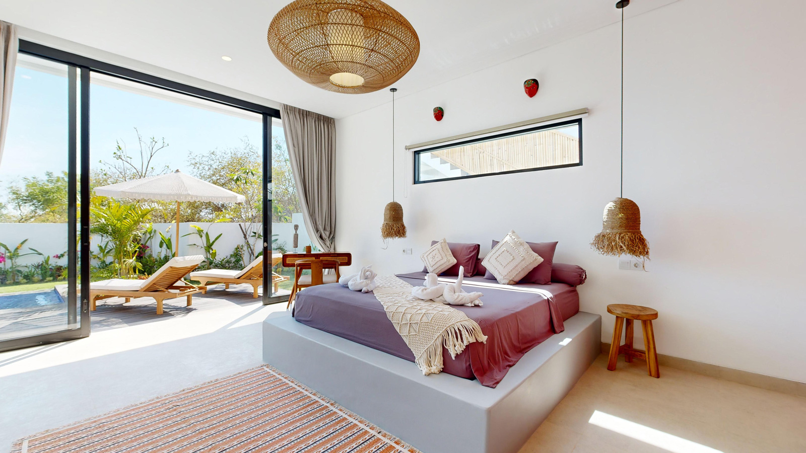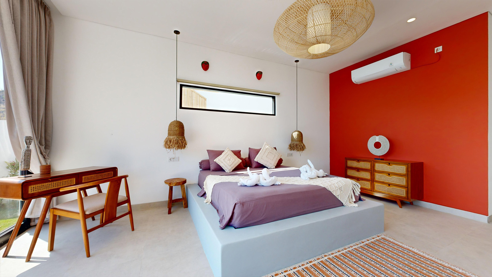 Inside, the villa boasts two expansive master bedrooms, each with its own modern en-suite bathroom, designed for ultimate comfort and privacy. The rooms are spacious and filled with natural light, offering panoramic views of the surrounding landscape. The open-plan living area flows seamlessly into a fully equipped kitchen, perfect for both relaxation and entertaining guests.